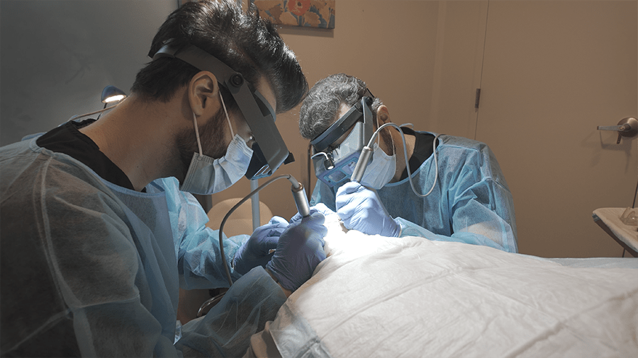 Greg Koher (right-handed) and Dr. Sessoms (left-handed) extract simultaneously from opposite sides of your head, unique in the United States. This reduces procedure time by 40%, improves graft survival by minimizing time outside the body, and maintains consistent quality throughout the entire procedure.